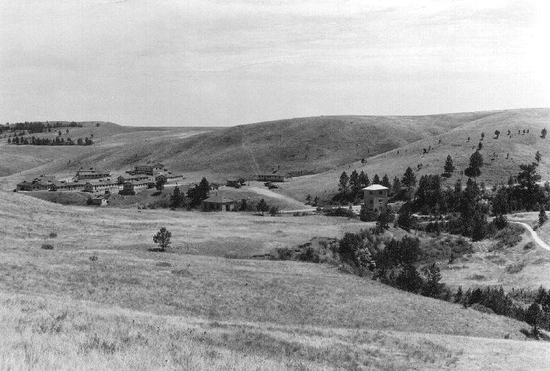 Camp Wind Cave was located southeast the cave entrance in Wind Cave Canyon. Only a few hundred yards from the entrance to the cave, it was protected by the hills of the canyon. The camp was built in a crescent shape partially encircling the water reservoir. The side hill gave good surface and sewer drainage, and the 5,000-gal reservoir perched on a hilltop 140 ft high provided an ample supply of water a pressure that would never be needed. The sewage disposal system was connected to that of the national park (1935).